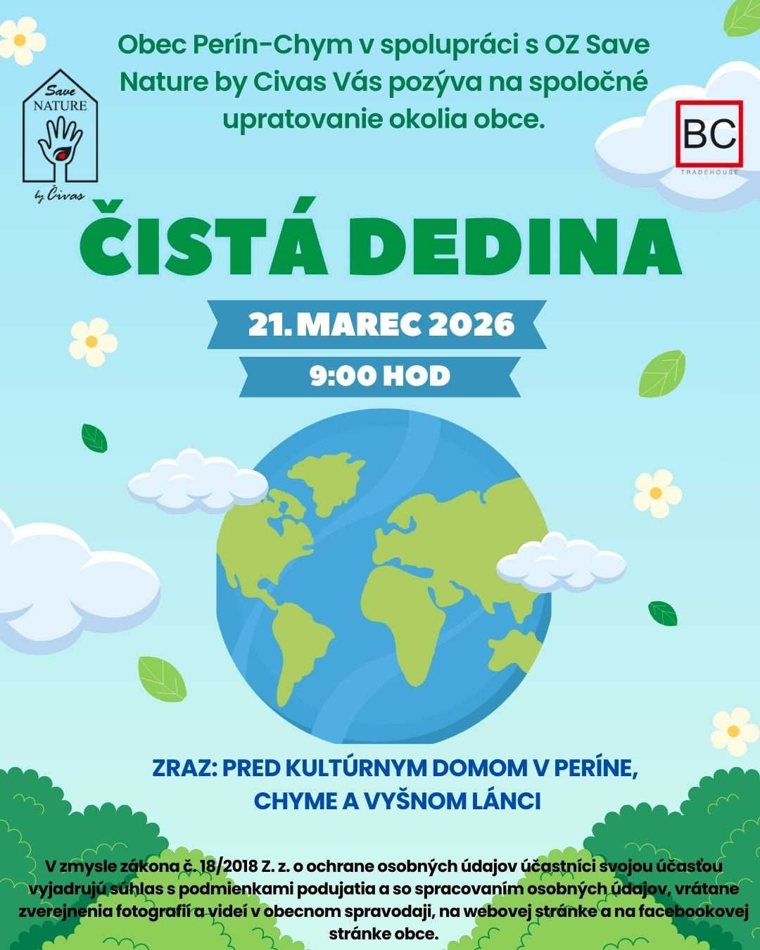 obec Perín‑Chym Vás srdečne pozýva na spoločnú brigádu Čistá dedina, ktorá sa uskutoční 21. marca 2026 o 9.00 hod.